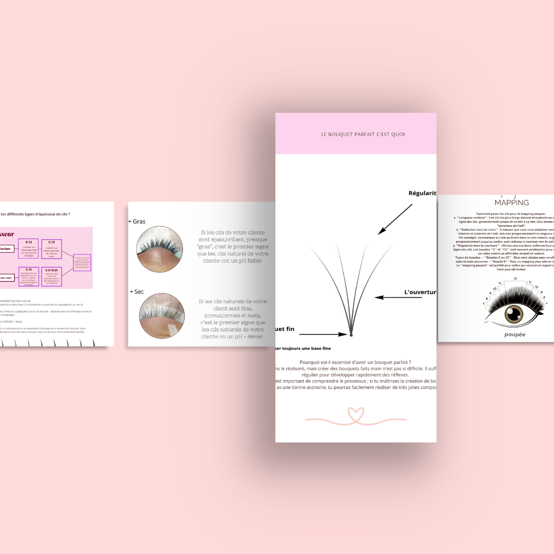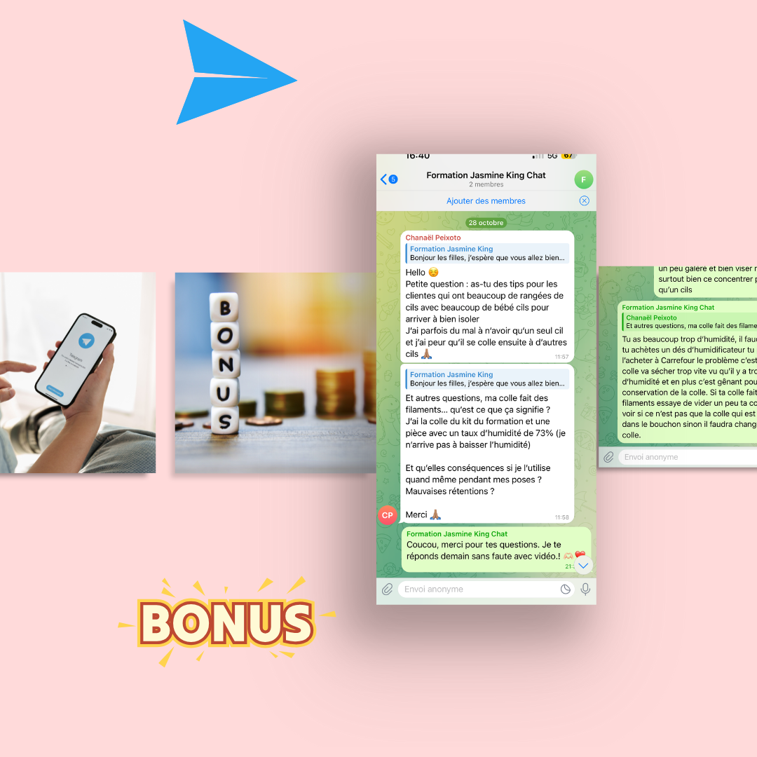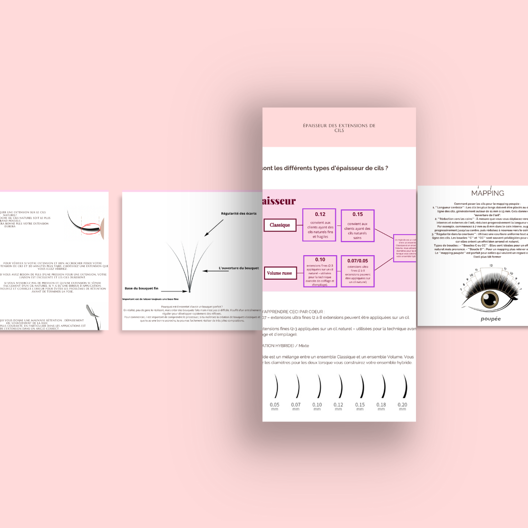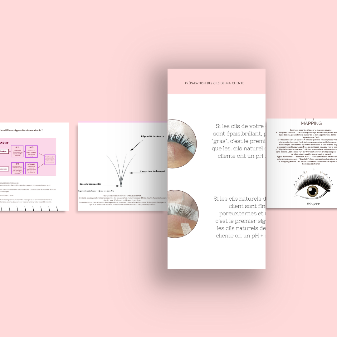 Grâce à ce guide, vous aurez tous les outils pour évoluer et progresser dans le domaine des extensions de cils. Vous pourrez offrir des poses magnifiques et durables qui satisferont vos clientes et les fidéliseront. Avec le soutien d'un groupe Telegram dédié, vous aurez également accès à une communauté de techniciennes partageant les mêmes objectifs, prête à vous soutenir à chaque étape de votre parcours.
